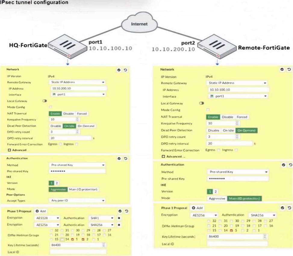 - A . On HQ-FortiGate, disable Diffie-Helman group 2.