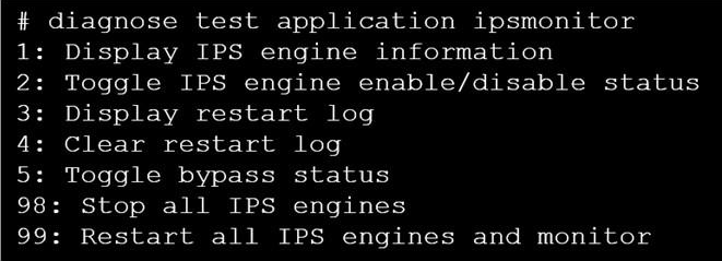 If there are high-CPU use problems caused by the IPS, you can use the diagnose test application ipsmonitor command with option 5 to isolate where the problem might be. Option 5 enables IPS bypass mode.