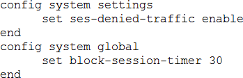 This option is in the CLI, and is called ses-denied-traffic. You can also set the duration for block sessions. This determines how long a session will be kept in the session table by setting block-sessiontimer in the CLI. By default, it is set to 30 seconds.