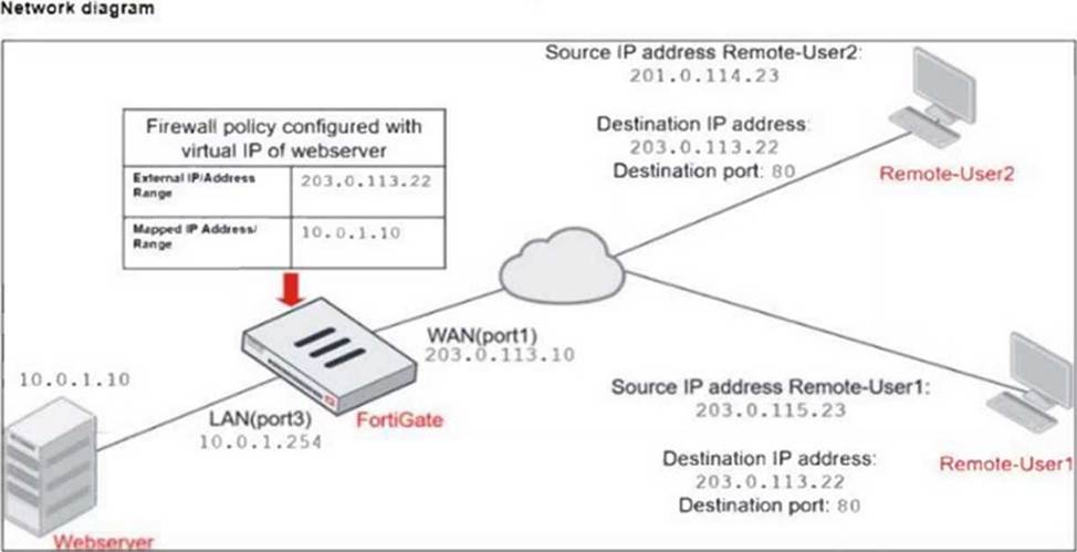 The exhibits show a diagram of a FortiGate device connected to the network, and the firewall configuration.