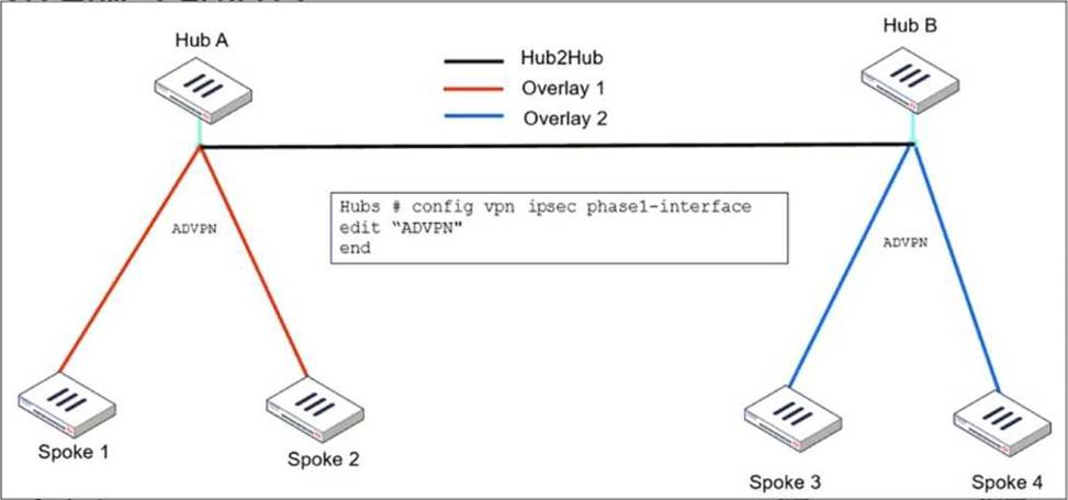 Refer to the exhibit, which shows the ADVPN IPsec interface representing the VPN IPsec phase 1 from Hub A to Spoke 1 and Spoke 2, and from Hub В to Spoke 3 and Spoke 4.