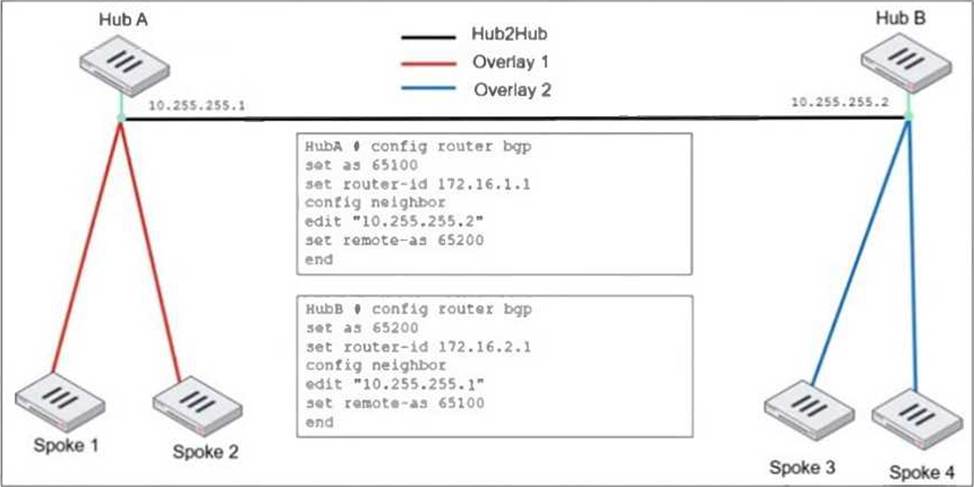 An administrator must configure an ADVPN using IBGP and EBGP to connect overlay network 1 with 2.
