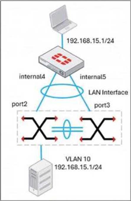 The diagram shows a FortiGate connected to two FortiSwitches, which suggests the use of FortiLink, Fortinet’s protocol for managing switches directly from a FortiGate. Since multiple connections are being used, the LAN interface must be set to 802.3ad (LAG) mode to aggregate the links for redundancy and load balancing.