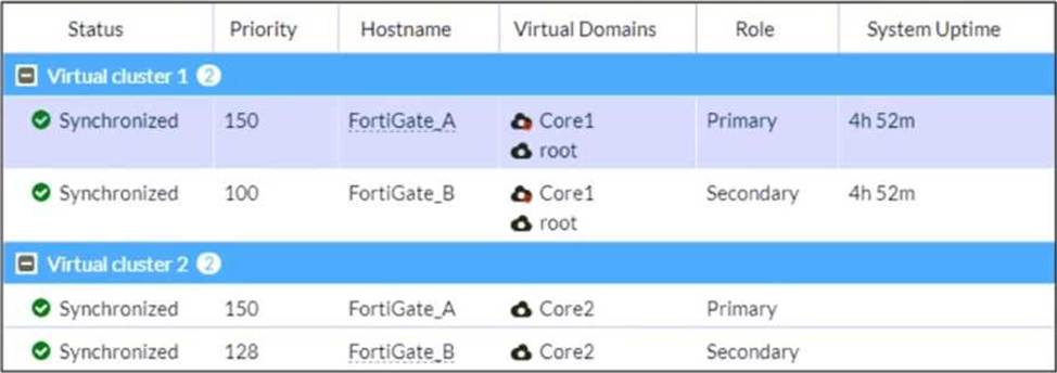 Currently, FortiGate_A has a priority of 150 for Core2, while FortiGate_B has 128. Increasing FortiGate_B’s priority to 200 ensures it becomes the primary for Virtual Cluster 2, taking over the Core2 VDOM traffic while keeping Core1 traffic on FortiGate_A.