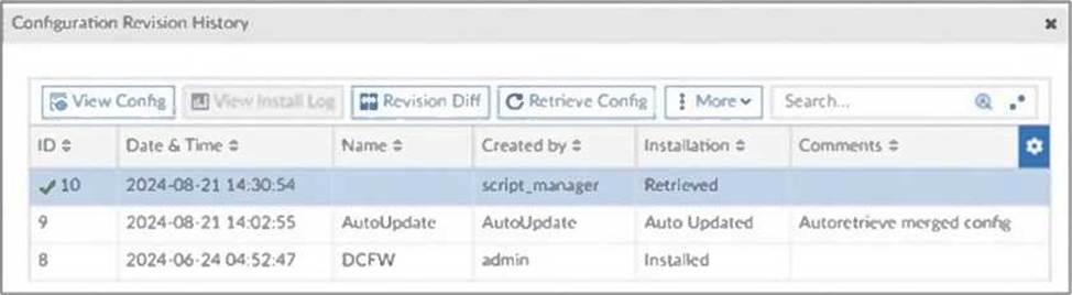 Refer to the exhibit, which shows a revision history window in the FortiManager device layer.