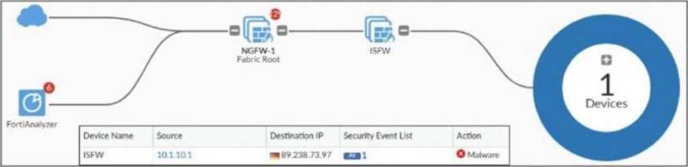 ● If NGFW-1 detects malware from IP 10.1.10.1 to 89.238.73.97, this information can be propagated to ISFW and FortiAnalyzer.