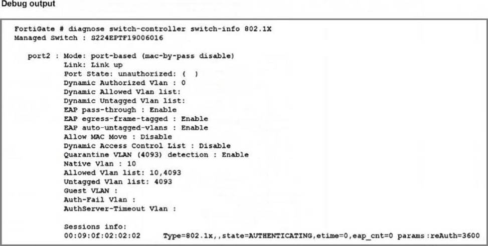 Port2 on FortiSwitch is configured with an 802.1X authentication security policy, but a device connected to port2 is unable to access the network. The administrator has gathered the diagnose output, as shown in the exhibit, to investigate the issue .