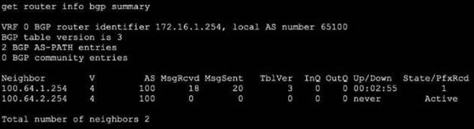 - A . The local ForliGate has received one prefix from BGP neighbor 100.64.1.254.