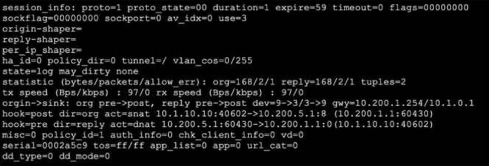The session output reveals a session with proto=1 (ICMP) and the origin and reply directions show address and NAT translations. Specifically, the hook=post dir=org act=snat shows that source NAT is performed for outgoing packets, where the source 10.1.10.10:40602 is translated to 10.200.5.1:8 (likely ICMP id 8, not a TCP/UDP port). The reply direction, hook=pre dir=reply act=dnat, indicates destination NAT for incoming packets: packets incoming for 10.200.5.1:60430 are destination-NATed to 10.1.10.10:40602. The gateway (gwy) is listed as 10.200.1.254/10.1.0.1, which for outgoing traffic means that return traffic is directed to the gateway (10.200.1.254), per the NAT policy. This is confirmed by the FortiOS Session Table Guide, which explains that the returned ICMP reply will be routed out to this NAT gateway. The session statistics and logical flow (SNAT out, matching DNAT in) reinforce that reply traffic to the initiator traverses via 10.200.1.254.