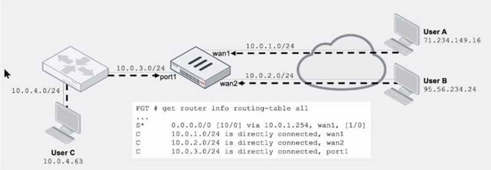 - D . User B: Pass. FortiGate will use asymmetric routing using wan1 to reply to traffic for 95.56.234.24.