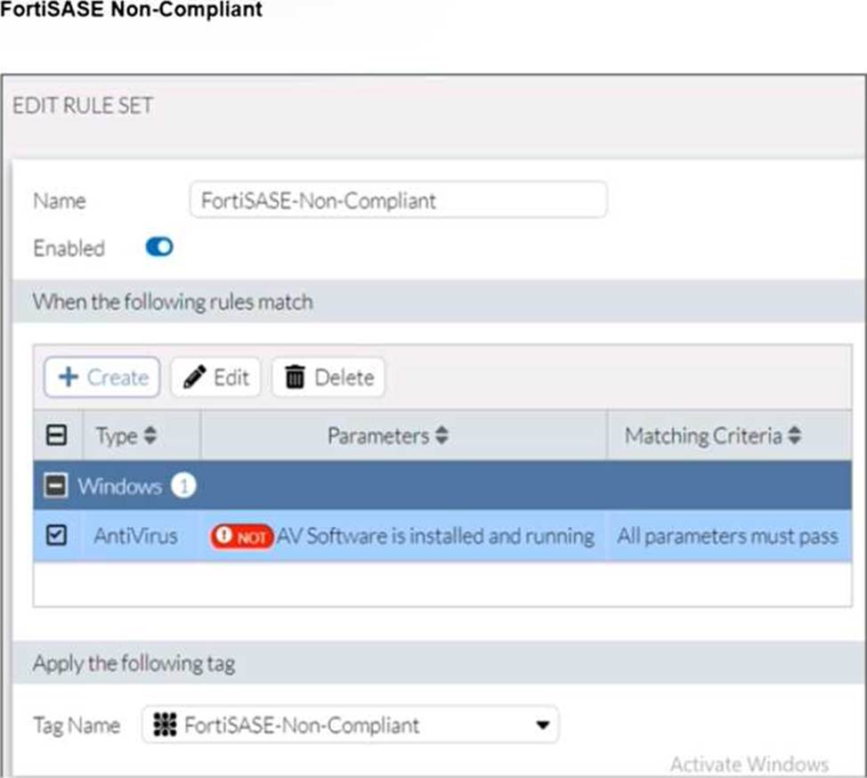 Although the antivirus is installed, it is not running due to the Windows application firewall blocking it. According to the FortiSASE-Non-Compliant rule, antivirus software must be both installed and running. Since this condition fails, FortiClient assigns the FortiSASE-Non-Compliant tag to the endpoint.