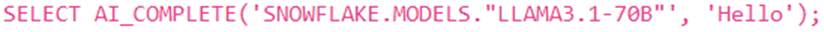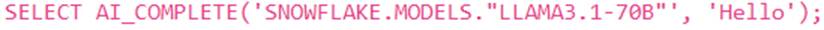 Option B is correct. When a model name is provided as a string argument, Cortex first treats it as an identifier for a schema-level model object. If found, RBAC is applied. The user’s role has ‘SNOWFLAKE."CORTEX-MODEL-ROLE-LLAMA3.1-70B"’ granted, which provides access to the ‘LLAMA3.1-70B’ model object in ‘SNOWFLAKE.MODELS’, regardless of the ‘CORTEX MODELS_ALLOWLIST setting for plain model names.