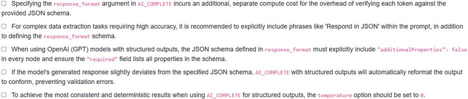 Which statements accurately reflect the best practices and characteristics when using AI_COMPLETE with structured outputs for this scenario?