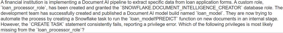 While the database role provides broad access to Document AI features and the ability to work on model builds, creating pipeline components like streams and tasks requires specific object privileges on the relevant database objects. For creating a task, the ‘CREATE TASK’ privilege on the schema where the task is being created is explicitly required.
