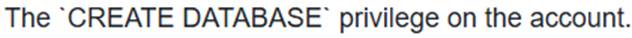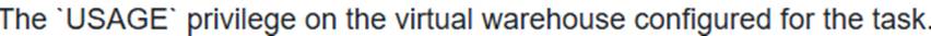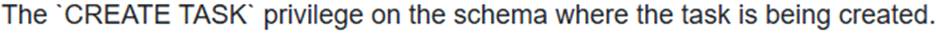 Option B (‘USAGE’ on warehouse) is necessary for the task to using that warehouse, but not for the ‘CREATE TASK statement itself to succeed.
