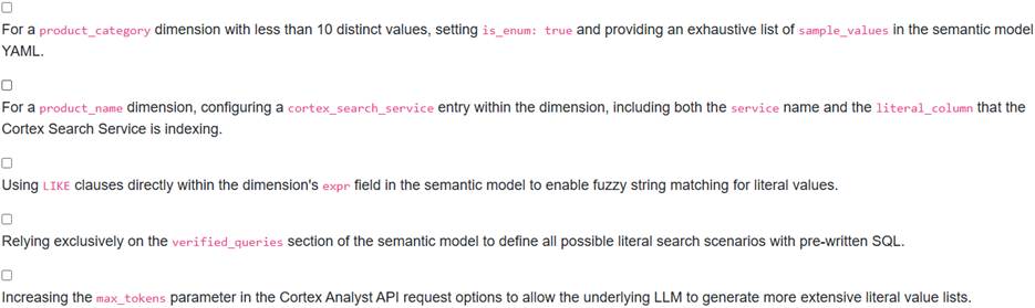 Option C is incorrect because Cortex Analyst leverages semantic similarity search or Cortex Search for literal values, not direct ‘LIKE clauses in the ‘expr’ field.