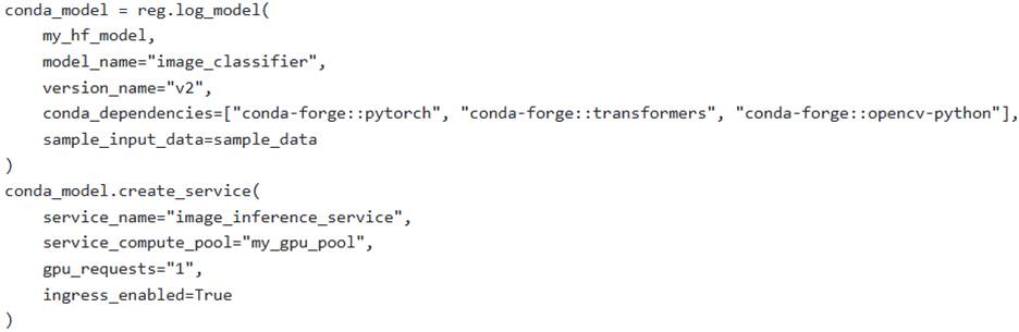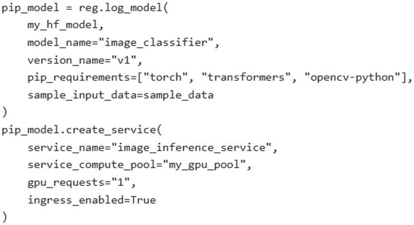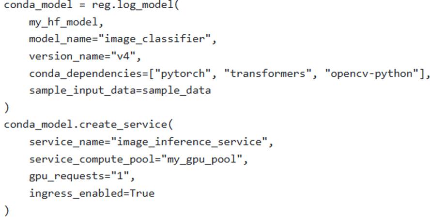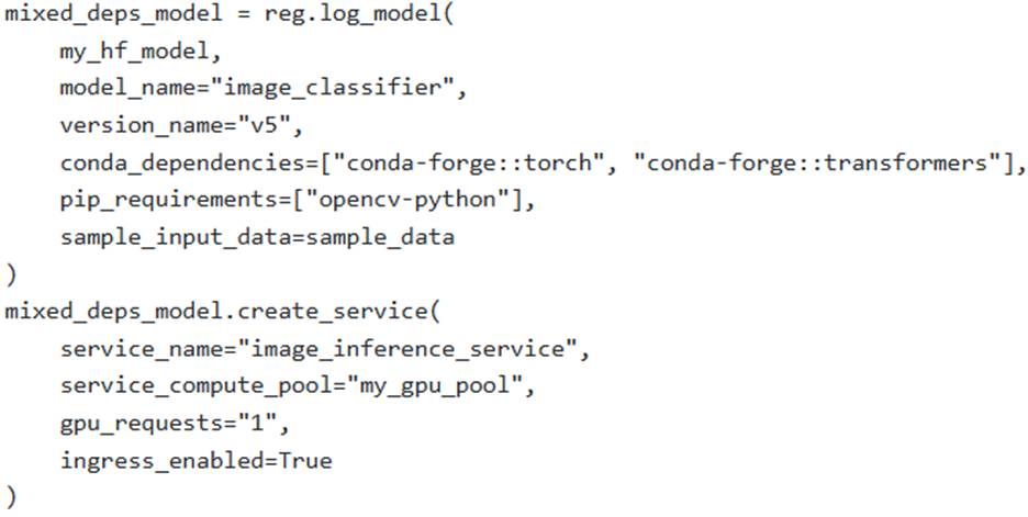 An ML engineer is deploying a custom PyTorch-based image classification model, obtained from Hugging Face, to Snowpark Container Services (SPCS). The deployment requires GPU acceleration on a compute pool named ‘my_gpu_pool’ and specific Python packages (‘torch’, ‘transformers’, ‘opencv-python’). The scenario dictates that ‘opencv-python’ is only available via PyPl, while ‘torch’ and ‘transformers’ can be sourced from either conda-forge or PyPl. The engineer uses the Snowflake Model Registry to log the model.