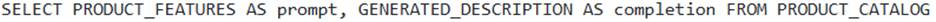 - B . The SQL query for the training data must select columns aliased as prompt and completion, such as: