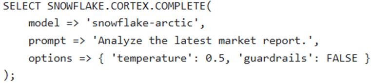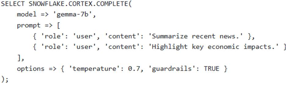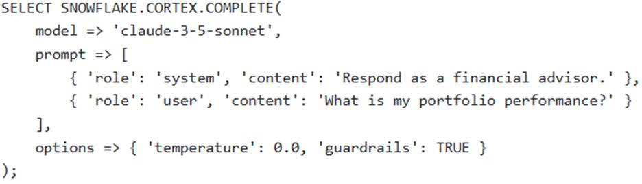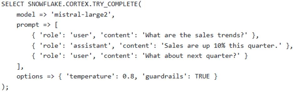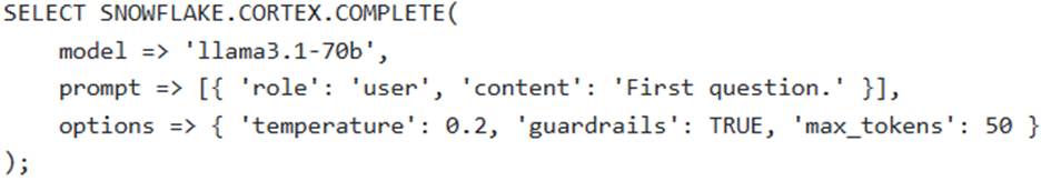 A software development team is building a conversational AI application within Snowflake, aiming to provide a dynamic and stateful chat experience for users. The application needs to handle follow-up questions while maintaining context, provide responses with a degree of creative variation, and actively filter out any potentially harmful content. The team utilizes the SNOWFLAKE. CORTEX. COMPLETE (or AI_COMPLETE) function.
