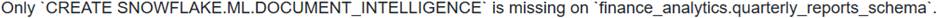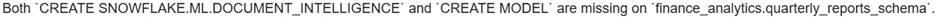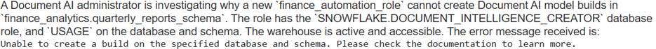 The troubleshooting documentation for the error message ‘Unable to create a build on the specified database and schema’ explicitly lists two primary causes related to missing schema-level privileges: ‘The ‘CREATE SNOWFLAKE.ML.DOCUMENT_INTELLIGENCE privilege is not granted to your role’ and ‘Your role has not been granted the ‘CREATE MODEL’ privilege on the schema that uses the model’. Both of these privileges are required on the schema to prepare a DocumentAI model build. Therefore, the combination of both missing would directly lead to this specific error.