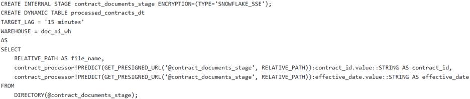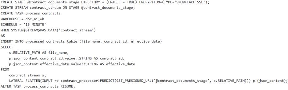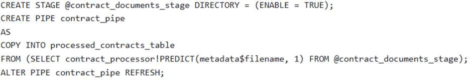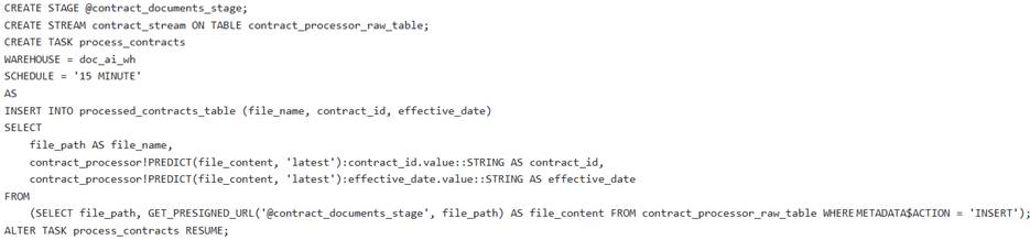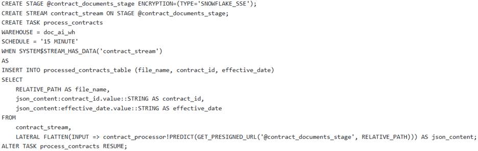 A data engineering team needs to establish an automated pipeline in Snowflake to continuously extract ‘contract_id’ and effective_date’ from new PDF contract documents uploaded to an internal stage named They have a pre-trained Document AI model named ‘contract_processor’.