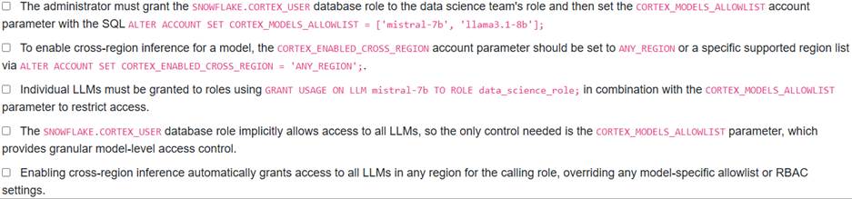 A Snowflake administrator is tasked with ensuring that a specific data science team can only use approved LLMs (mistral-7b, llama3.1-8b) for generative AI tasks within a particular schema, and also needs to enable the use of an LLM in a non-native region due to specific project requirements.