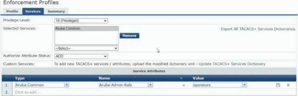 - D . Add the Aruba: Common service and set Aruba-Priv-Admin-User to the group name.