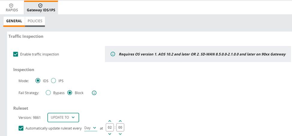 In the exhibit, the HPE Aruba Networking Central settings for the 9×00 gateway show that traffic inspection is enabled, and the gateway is set to operate in IDS (Intrusion Detection System) mode with the fail strategy set to "Block". This configuration means that the gateway will drop traffic if it matches a rule in the active ruleset.