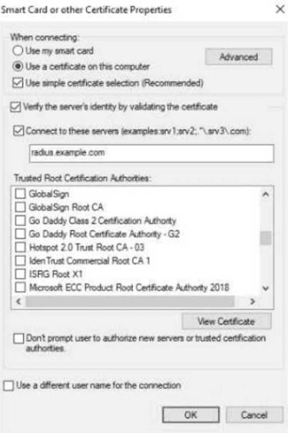 Server Validation: Specify the exact RADIUS server names in the "Connect to these servers" field.