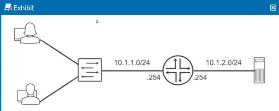 For the users in the 10.1.1.0/24 subnet and the server in the 10.1.2.0/24 subnet to communicate with each other, they need to route packets through the router that connects these two subnets. Each user and the server need to have their default gateway set to the IP address of the router interface on their respective subnet (.254). This ensures that packets destined for other subnets are sent to the router, which then routes them to the correct destination subnet.