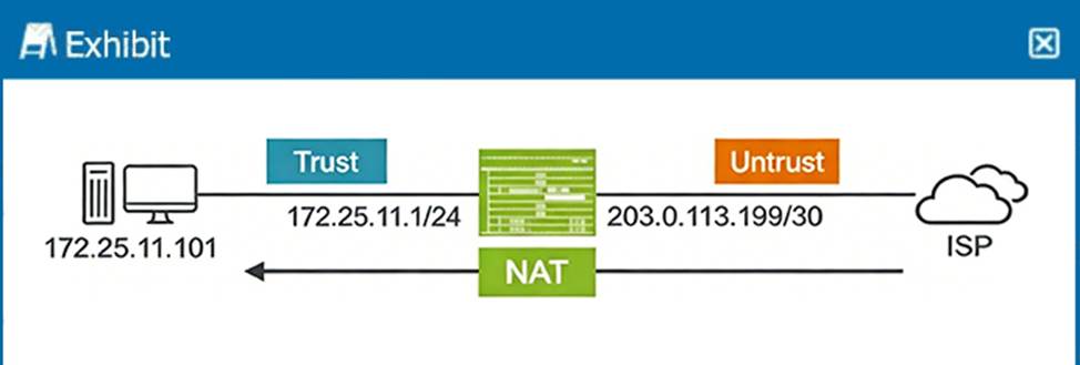 Destination NAT only (Option A): Maps the external/public IP (203.0.113.199) to the internal/private IP (172.25.11.101). This allows inbound connections to be translated and sent to the internal host. The internal host cannot initiate outbound sessions, since the translation only applies to inbound traffic.
