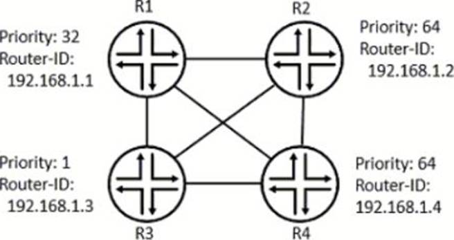 R1 was started at 4:00 PM. R2 and R3 were started at 6:00 PM. R4 was started at 10:00 PM. All routers are in Area 0 and there are no point-to-point links.