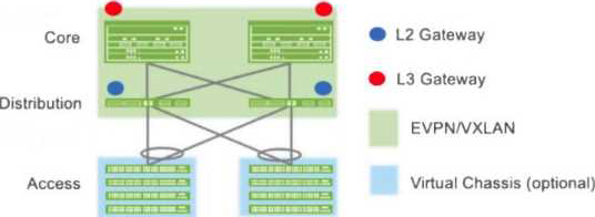 L2 gateways (blue dots) positioned at the distribution layer.