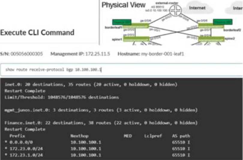 The exhibit shows the border leaf receiving multiple routes via BGP from the external router, including 172.23.x/24 prefixes, and those routes appearing in the Finance VRF routing table. To stop these routes from being installed in the Finance table, you must change what the border leaf imports from that eBGP session. In Apstra, this control is implemented through a Routing Policy attached to the protocol session described by the connectivity template. By setting the Import Policy to accept default route only, Apstra renders Junos policy so that only 0.0.0.0/0 is imported into the VRF, while the 172.23.x/24 prefixes are rejected and therefore never installed in Finance.inet.0.