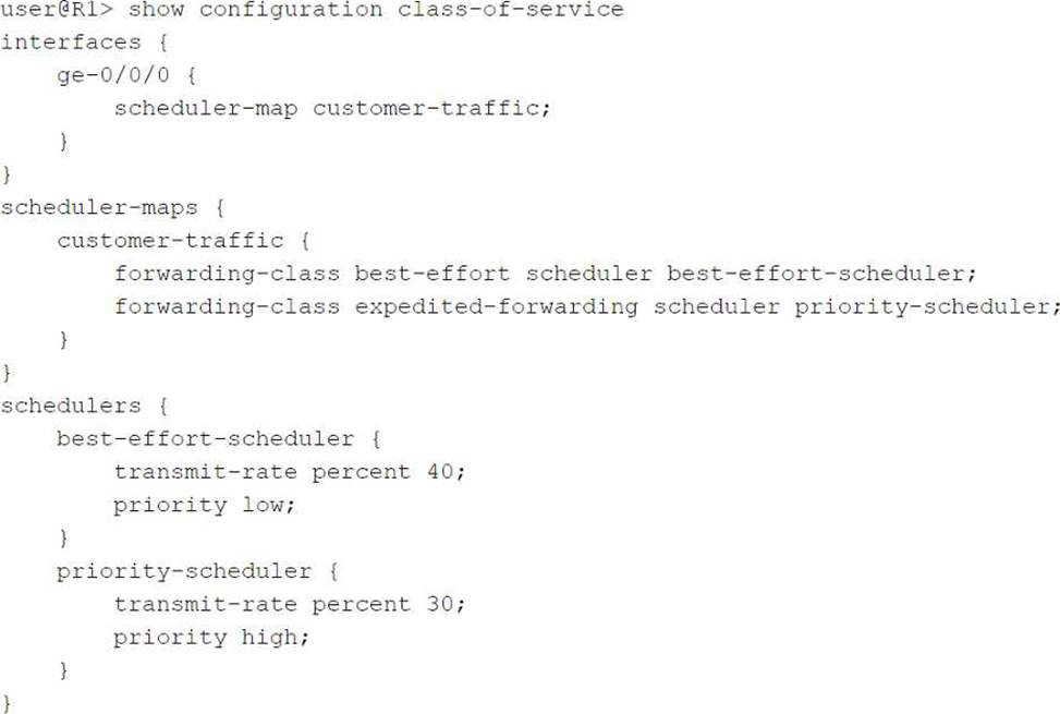 The class-of-service (CoS) configuration in the exhibit shows how traffic is scheduled on the ge-0/0/0 interface.