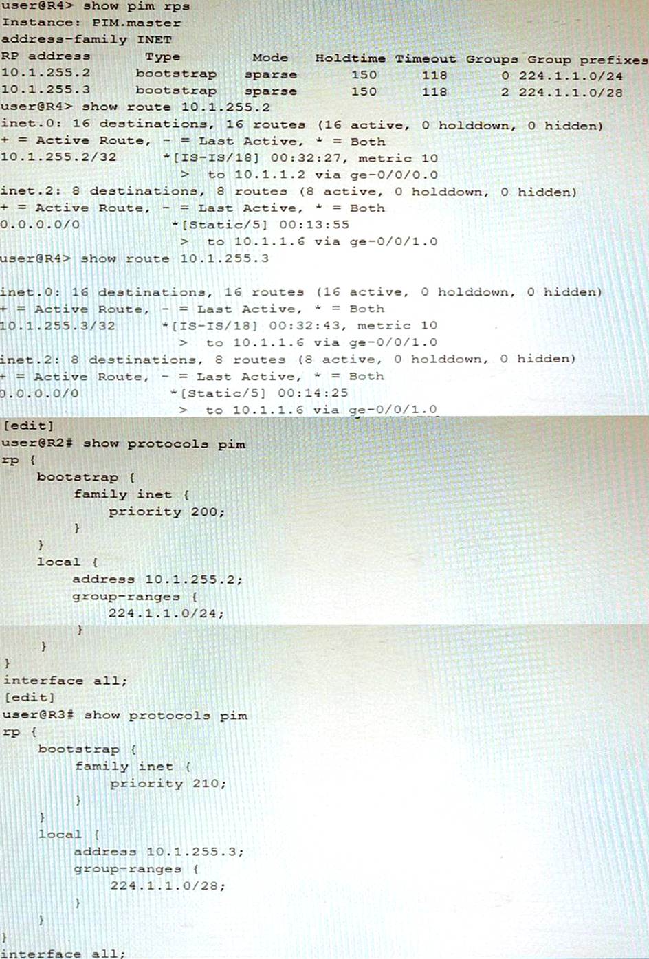 R4 is directly connected to both RPs (R2 and R3) R4 is currently sending all ,o,ns upstream to R3 but you want all joins to go to R2 instead Referring to the exhibit, which configuration change will solve this issue?