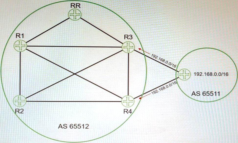 Referring to the exhibit, you are receiving the 192.168 0 0/16 route on both R3 and R4 from your EBGP neighbor You must ensure that R1 and R2 receive both BGP routes from the route reflector
