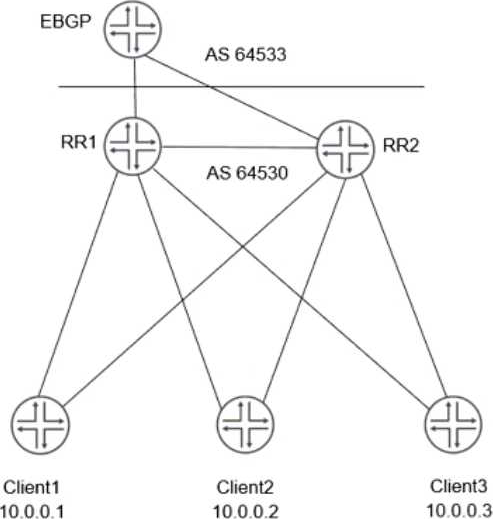 - C . RR1 and RR2 advertise routes learned from the clients to EBGP peers, using itself as the next hop.