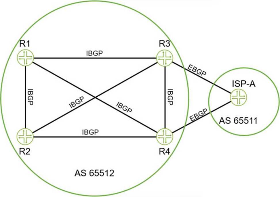 In the exhibit, we see an internal BGP (iBGP) setup within AS 65512, and an external BGP (eBGP) connection between R3 and ISP-A (AS 65511). The questions focus on the behavior of BGP routes advertised from R3 to R1 within the same AS.