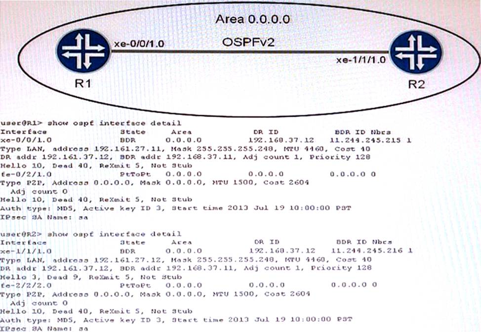 - C . There is a mismatch in the OSPF hold timer parameter between routers R1 and R2.