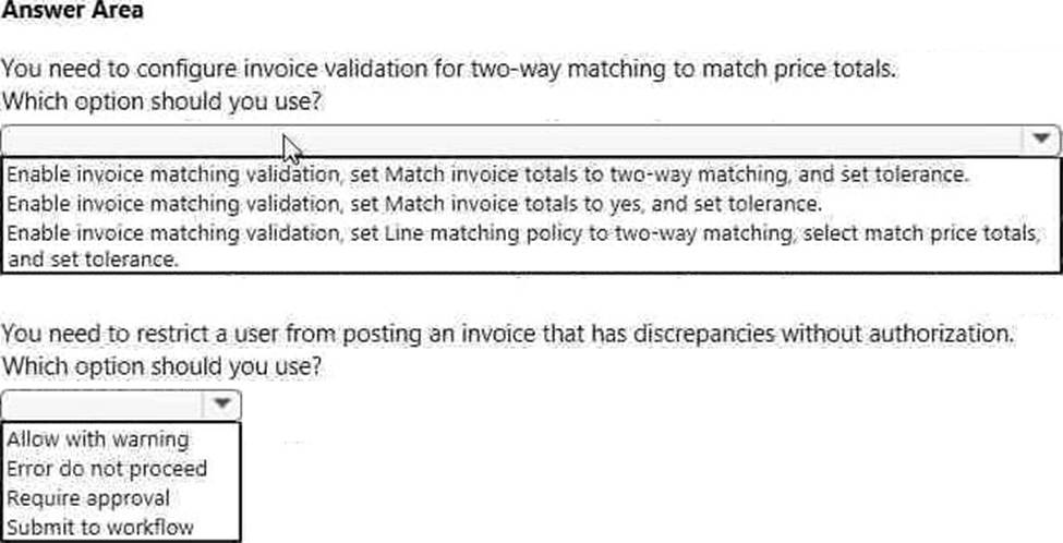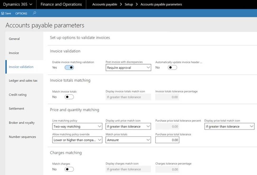 Reference: https://docs.microsoft.com/en-us/dynamics365/finance/accounts-payable/tasks/set-up-accounts-payable-invoice-matching-validation