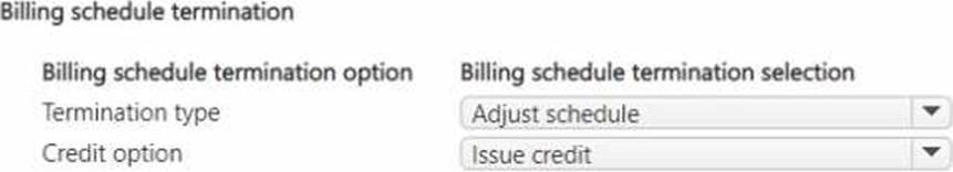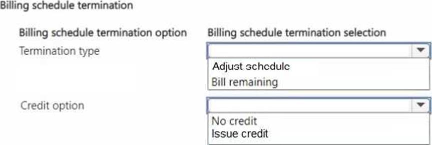 How should you complete the billing schedule termination? To answer, select the appropriate options in the answer area. NOTE: Each correct selection is worth one point.