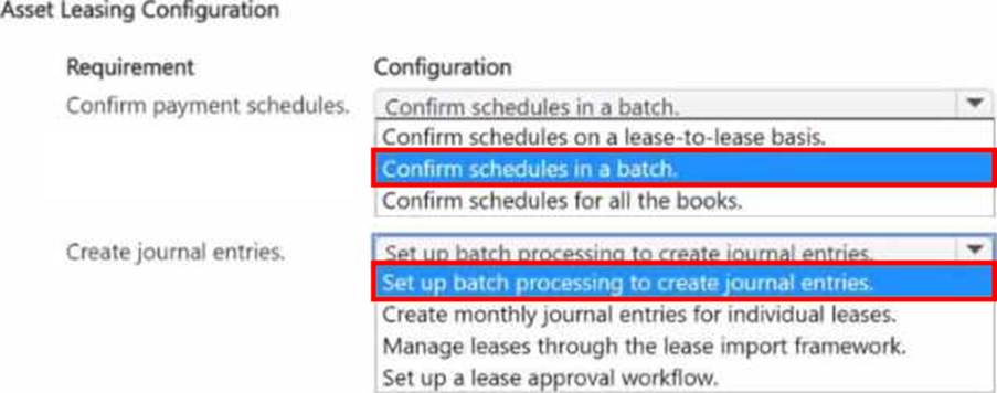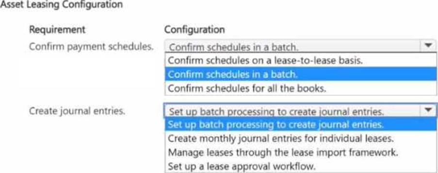How should you configure asset leasing? To answer, select the appropriate options in the answer area. NOTE: Each correct selection is worth one point.