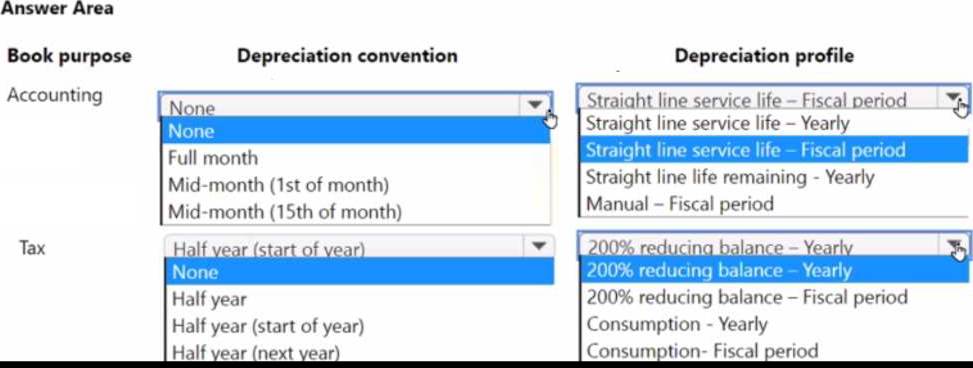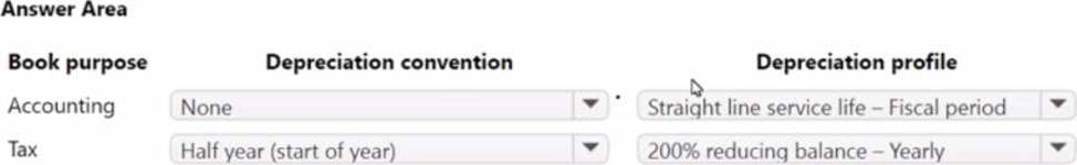 Which depreciation conventions and depreciation profiles should you use? To answer, select the appropriate options in the answer area. NOTE: Each correct selection is worth one point.