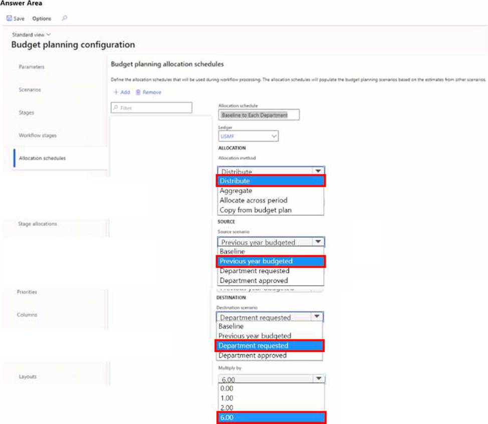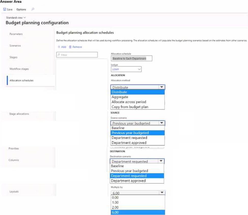 How should you configure budget planning? To answer, select the appropriate options in the answer area. NOTE: Each correct selectin is worth one point.