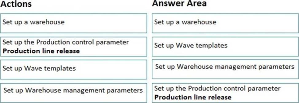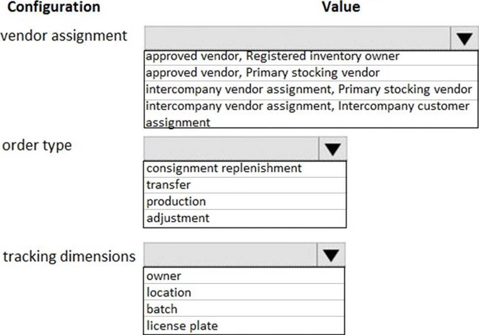 How should you complete the replenishment order? To answer, select the appropriate options in the answer area. NOTE: Each correct selection is worth one point.