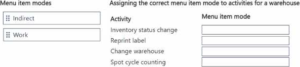 A company is configuring the handheld warehouse mobile device in Dynamics 365 Supply Chain Management Several warehouse activities are documented as required configurations. The activity configurations require a menu item in the device interface.