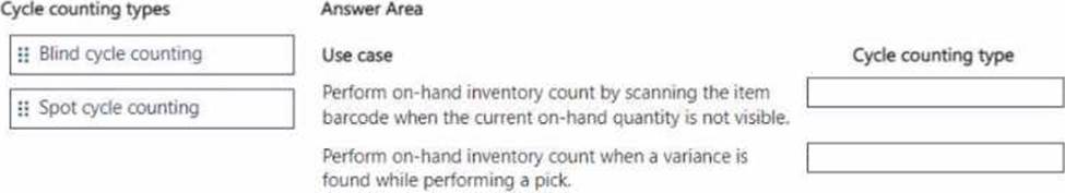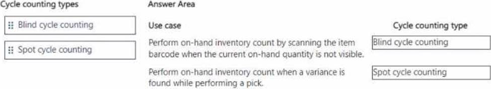 Which cycle counting types should you perform? To answer, drag the appropriate cycle counting types to the correct use cases. Each cycle counting type may be used once, more than once, or not at all. You may need to drag the split bar between panes or scroll to view content. NOTE: Each correct selection is worth one point.