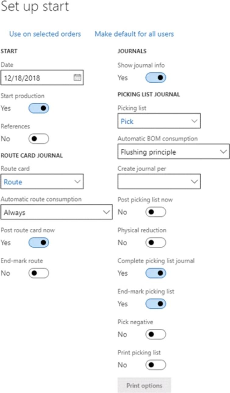 You have set up the default Start user options for all production orders as shown in the exhibit below.