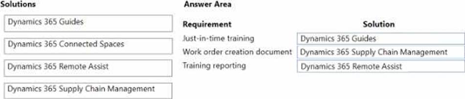 Just-in-time training: You should use Dynamics 365 Guides. This solution allows you to create interactive, step-by-step learning experiences for repair technicians in the field. You can use videos, images, and text to provide instructions and tips for work order completion. You can also use mixed reality tools to overlay holograms on physical objects and guide technicians through complex tasks. Work order creation document: You should use Dynamics 365 Supply Chain Management. This solution allows you to create and manage work orders for equipment maintenance and repair. You can use the Work order page to enter the details of the work order, such as the customer, the equipment, the service tasks, the materials, and the costs. You can also print a work order report that summarizes the information in a single document.